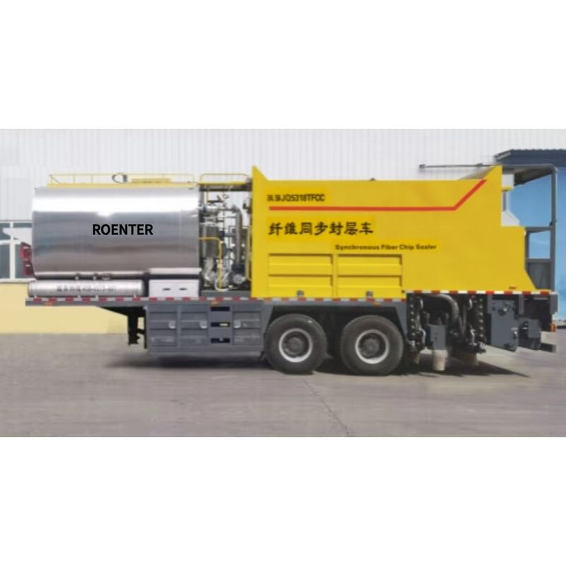 This Semi-Trailer Fibre Chip Sealer is developed by our company, with independent intellectual property rights of special equipment (a total of six national patents). The equipment adds asphalt double-row spraying and fiber spraying structure on the basis of ordinary synchronous sealing vehicle, and is used for synchronous crushed stone sealing process in asphalt pavement wearing layer, semi-rigid pavement and white to black pavement stress absorbing layer, high-speed fine anti-skid layer, bridge deck waterproof layer and lower sealing layer. The machine, electricity and liquid integration operation is achieved. The product is simple to operate, reliable in quality and convenient to maintain. The product technology has reached the world advanced level.